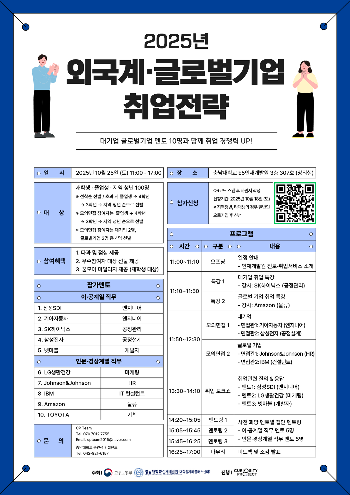 2025년 외국계·글로벌기업 취업전략 재학생과 졸업생의 진로설정과 취업 지원을 위하여 2025년 외국계·글로벌기업 취업전략 프로그램을 운영합니다. 많은 참여 바랍니다. ※ AMAZON, TOYOTA등 유명 외국계기업 멘토들과 삼성전자,SK하이닉스 등 국내 대기업 멘토들이 오십니다.