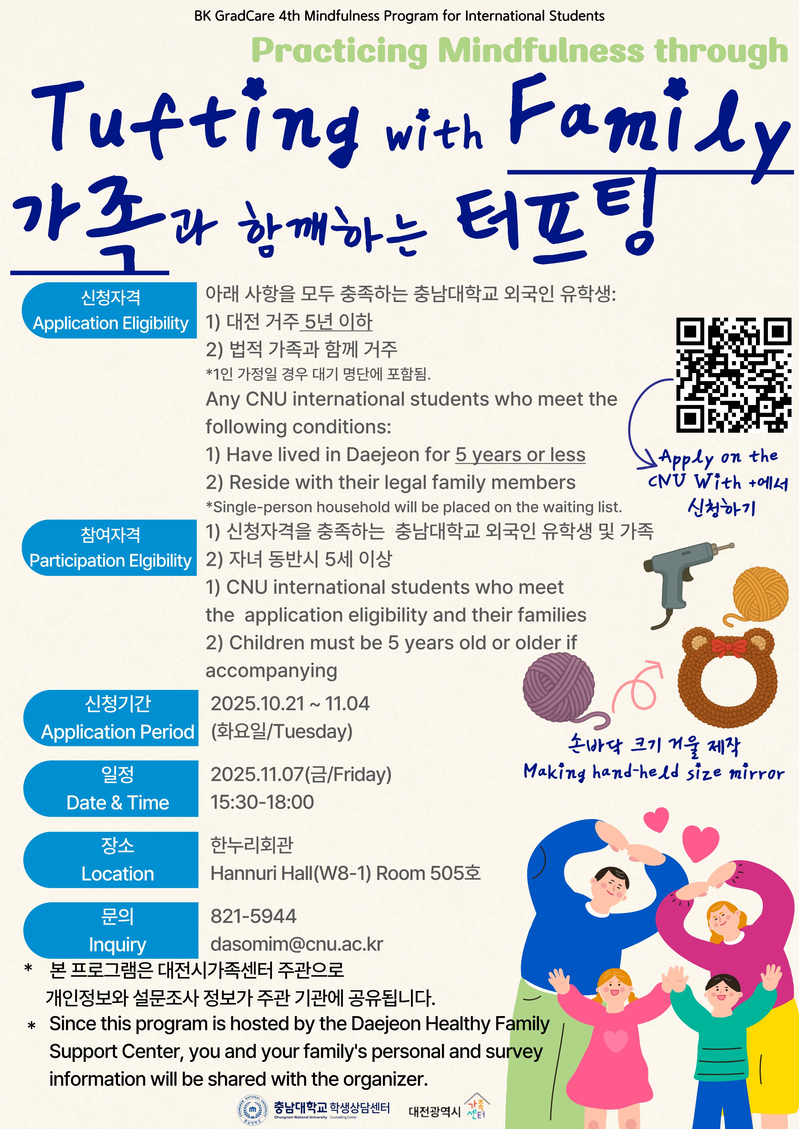 4단계BK21대학원혁신사업] 외국인 대학원생 마음챙김 프로그램 학생상담센터에서는 대전 거주 5년 이하 외국인 유학생과 법적 가족의 가족관계 개선 및 스트레스 관리를 위하여 터프팅 미술 활동 기반 마음챙김 프로그램을 다음과 같이 운영합니다. 관심 있는 학생들의 신청 바랍니다. 가. 모집대상: 대전 거주 5년 이하 재학 외국인 유학생 및 법적 가족 * 다인 가정 우선 선발로 1인 가정 신청자의 경우 대기자 명단에 포함됨. 나. 모집인원: 8명(선착순 모집) 다. 모집일정: 2025. 10. 21.(화) ~ 11. 4.(화) 라. 운영일정: 2025. 11. 7.(금) 15:30-18:00 마. 장 소: 한누리회관(W8-1) 505호 바. 운영언어: 한국어 및 영어 사. 신청링크: https://with.cnu.ac.kr/ * 대전시 가족센터 주관 프로그램으로 참가자의 개인정보 및 설문자료가 주관 기관에 공유될 예정임. 아. 세부내용: <붙임 1> 참고 |